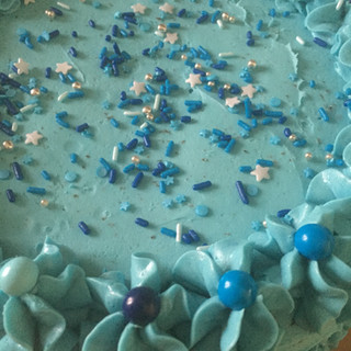 This birthday girl wasn't sad to get this chocolate birthday cake, with blue buttercream frosting and a custom sprinkle mix in various shades of her favorite color, along with some white and silver accents.