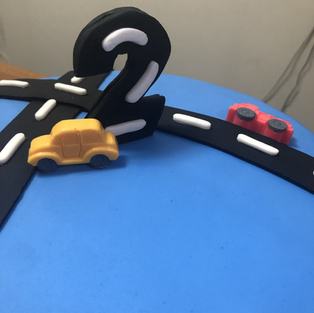 For this two-year-old's car-themed birthday cake, I made a vanilla cake with vanilla buttercream underneath the blue fondant (the birthday boy’s favorite color). The roads and the “2” are black and white fondant; the cars and trucks are white chocolate in primary colors. The client sent photos of the birthday boy with his cake and he seemed to really enjoy it, so I am happy about that!
